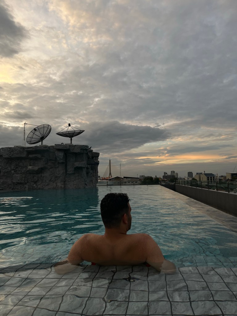 Nach dem Mittagessen spazieren wir durch die Straßen von Bangkok, aber schnell soll der Standort gewechselt werden, ab zur Khao San Rd. da wartet unsere erste Massage schon auf uns, ich kam zufrieden raus, Emily hatte ein paar schmerzen… halb so wild, wir gehen ins Hotel um uns abzukühlen (32 Grad gefühlt 45)… schnell umgezogen und rein in den Pool, ah herrlich: