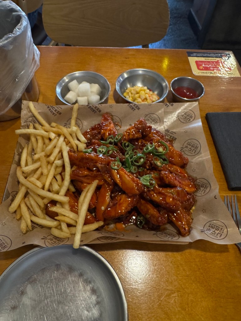 Spicy Boneless chicken gibt es heute. Eine Riesen Portion und hier heißt spicy wirklich spicy, so dass sogar ich kämpfen muss mit der Schärfe.